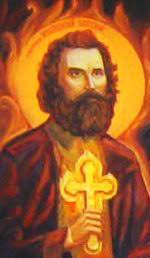 Из гроба раздался гулко звучащий в чутком слухе Иннокентия, но не слышимый другими голос: «Отец Иннокентий, возьми крест мой!» Иннокентий прислушался. «Отец Иннокентий, возьми крест мой!» — громоподобно зазвучало из горнего мира. И тут чудотворец привстал из гроба, и протянул своему наследнику снятый с груди деревянный крест. «Возьми его и иди, да осияет тебя огонь Святого Духа, и нечестивые падут. Зови народы к покаянию и так учи: не захотят по своей воле — покаются поневоле. Огнем и мечом очистится земля». Иннокентий превратился точно в огненную колесницу...